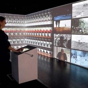 In the Panorama room visitors are surrounded from all sides by film clips and use seven control touch screens to thematically navigate through the EYE collection can.