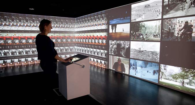 In the Panorama room visitors are surrounded from all sides by film clips and use seven control touch screens to thematically navigate through the EYE collection can.