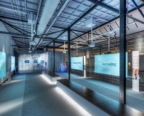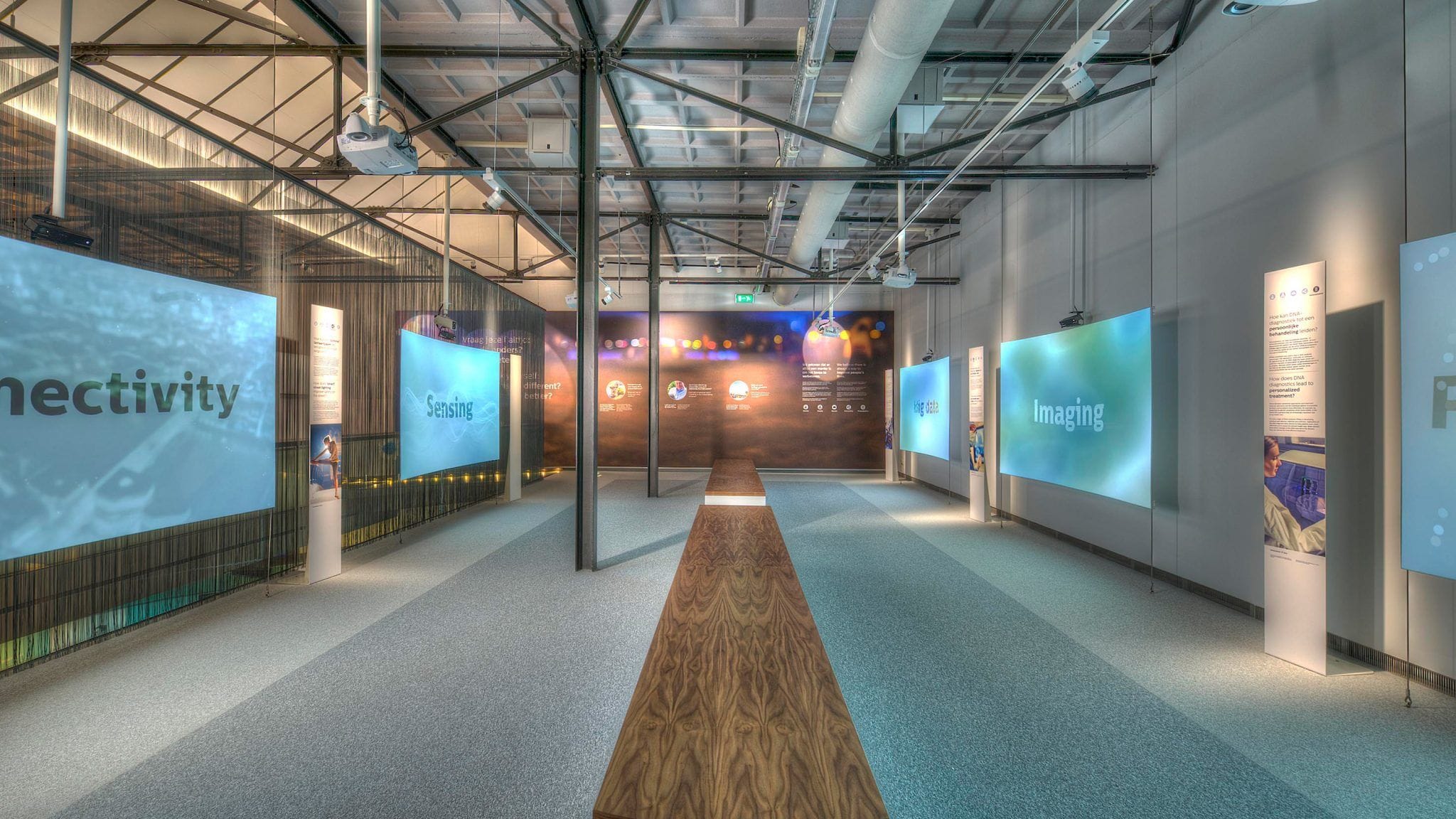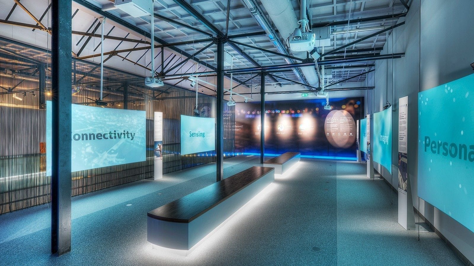 The highlight of the exhibition are five big interactive projections that respond to individual visitors and let them experience how modern technology has been changing our lives. The projections show five big innovations: big data, sensing, imaging, personalization and connecting.