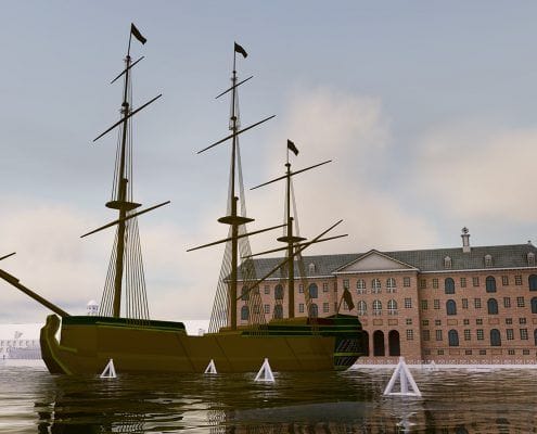 With the VR, visitors make a flight over Amsterdam’s historic port and experience how this area develops at a fast pace into a busy place. They witness a number of events, such as the creation of the impressive yard and the naval storehouse (‘s Lands Zeemagazijn – the current museum) and the construction and launch of a warship.