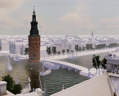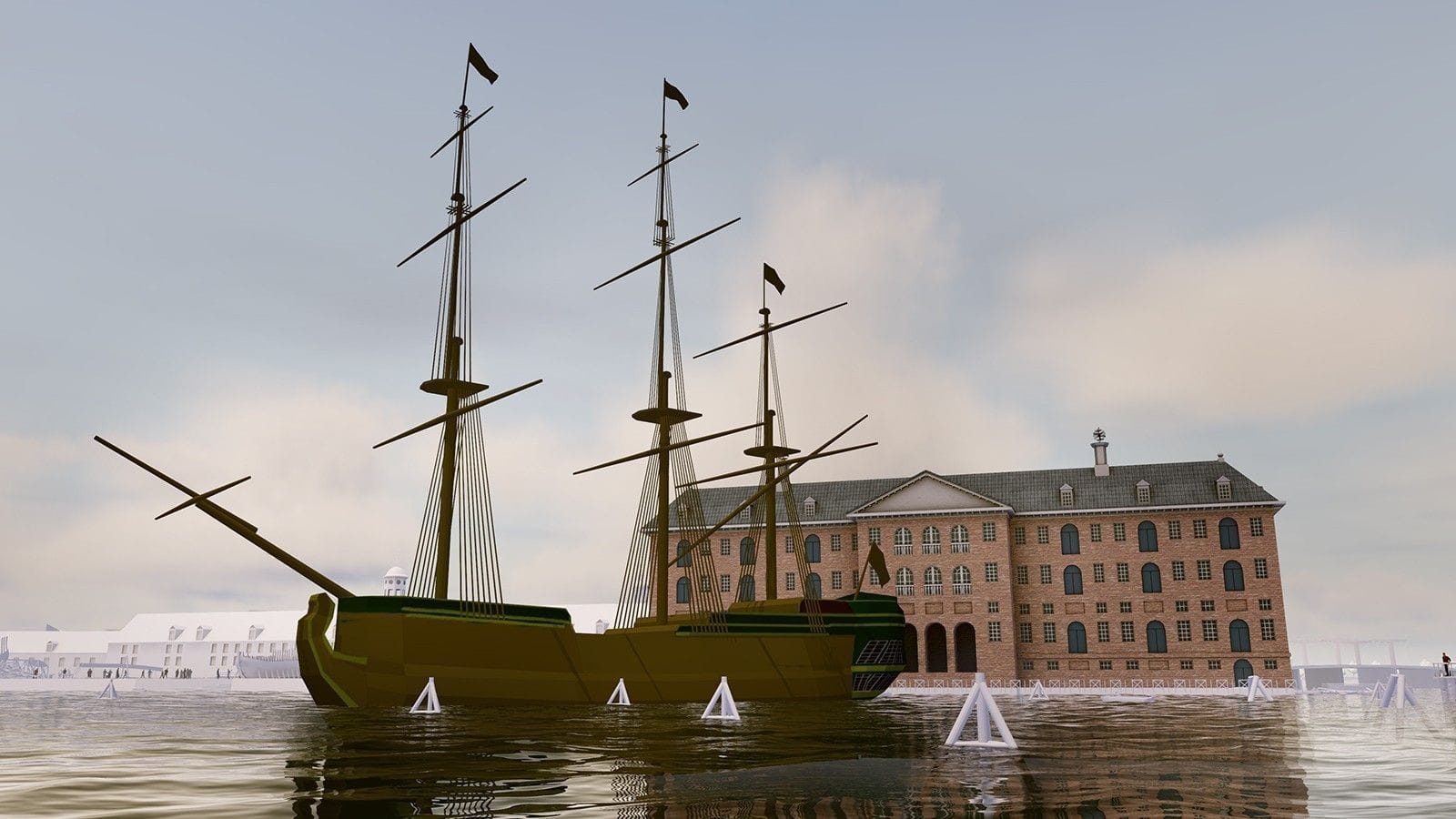 During the VR journey, the visitor is in the middle of the port of 17th century Amsterdam. Closely and from a distance, he is watching several events and activities of sailing ships, rowing boats and ships that are under construction. At the start of the VR the Amsterdam skyline is still open. During the VR new land is created. Here the yard and ‘s Lands Zeemagazijn are being built. The Montelbaan tower is also visible, with traders of different nationalities and the supply and discharge of goods and services. This is also where sailors and soldiers say goodbye to their family and embark on the VOC. And don’t we see Michiel de Ruyter walking there with his wife?